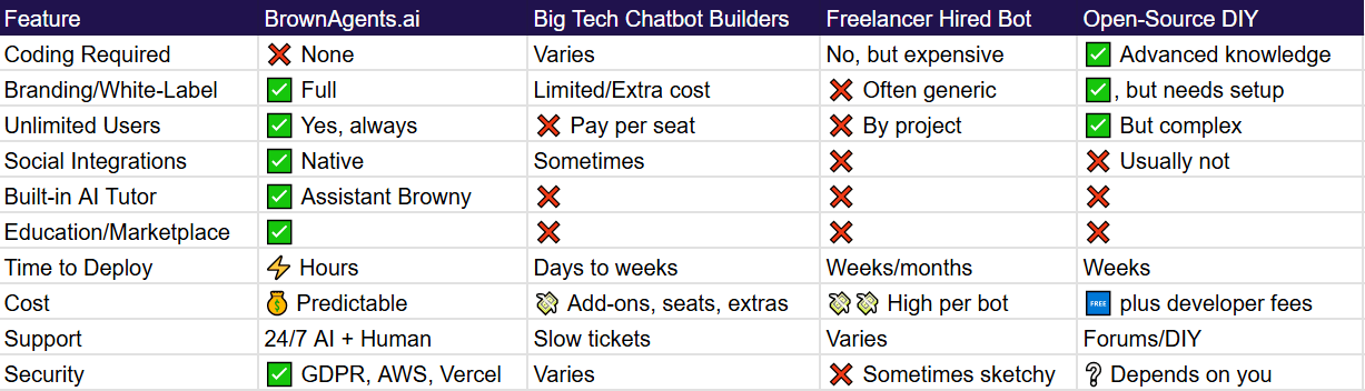 In a sea of chatbots and automation tools, side-by-side comparison matters. Here’s how BrownAgents.ai stacks up: